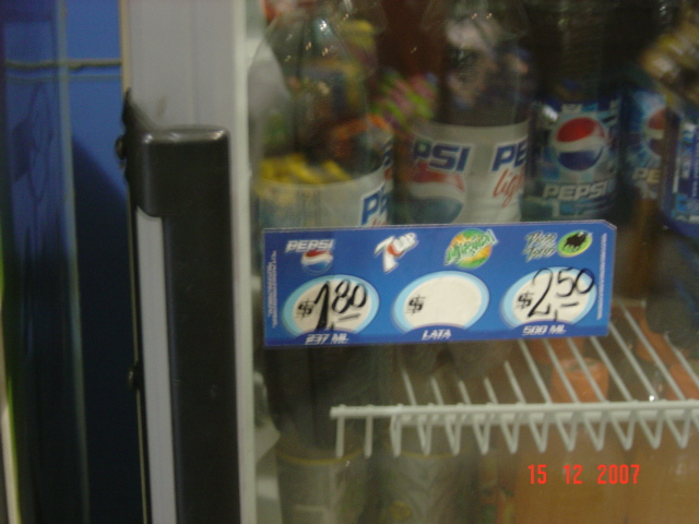 Producto en una vidriera (o góndola) que valga $550 Dos personas con gorros de Midnight Soret Producto en una vidriera (o góndola) que valga $1.80
