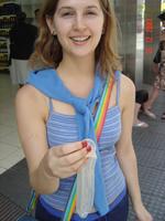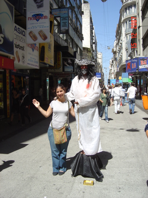 Integrante al lado de una estatua viviente, imitándola Integrante con un preservativo desenrollado en su mano Integrante atado a un poste